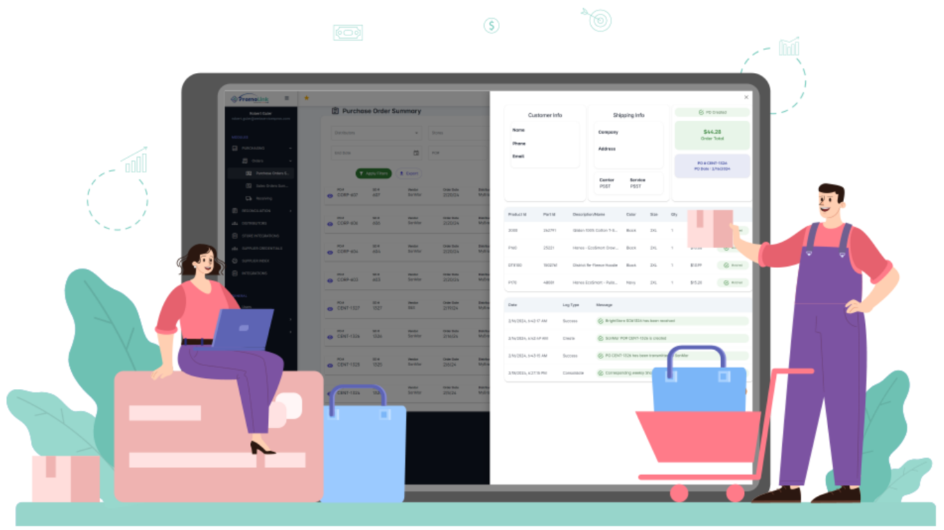 From the sales order, Purchasing generates purchase orders—sent electronically to suppliers or decorators, with no re-entry.